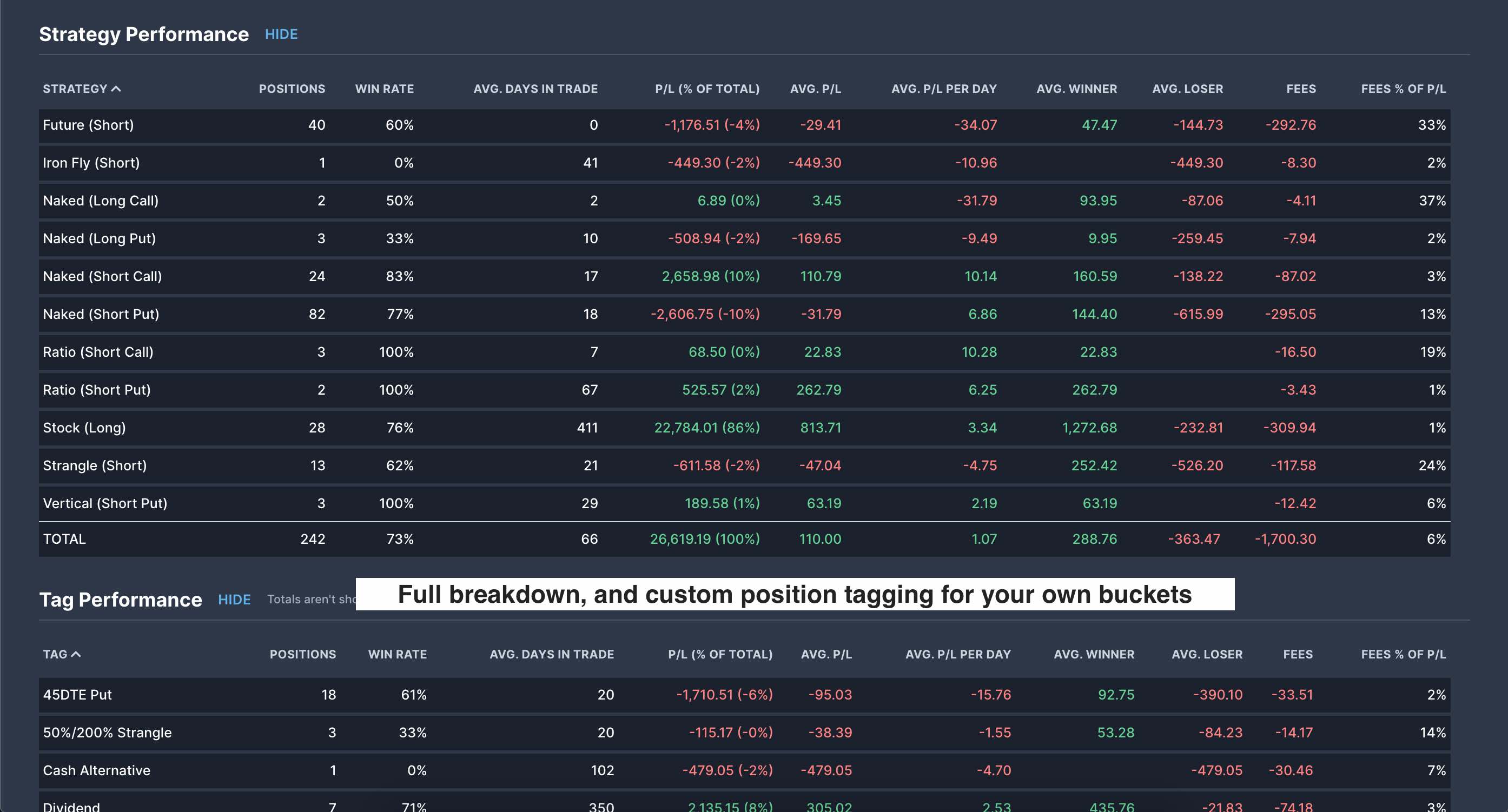 Use custom position tags to keep tabs on the performance of trade setups, trade idea sources, management techniques, or any other bucket you care about.