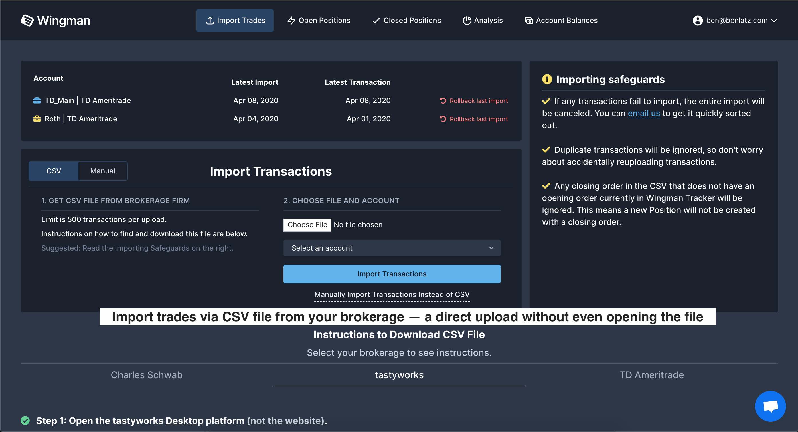 Export the CSV file of transactions from your brokerage platform and import to Wingman. A 1-minute process that’s so easy you’ll wonder why people still bother tracking trades manually.