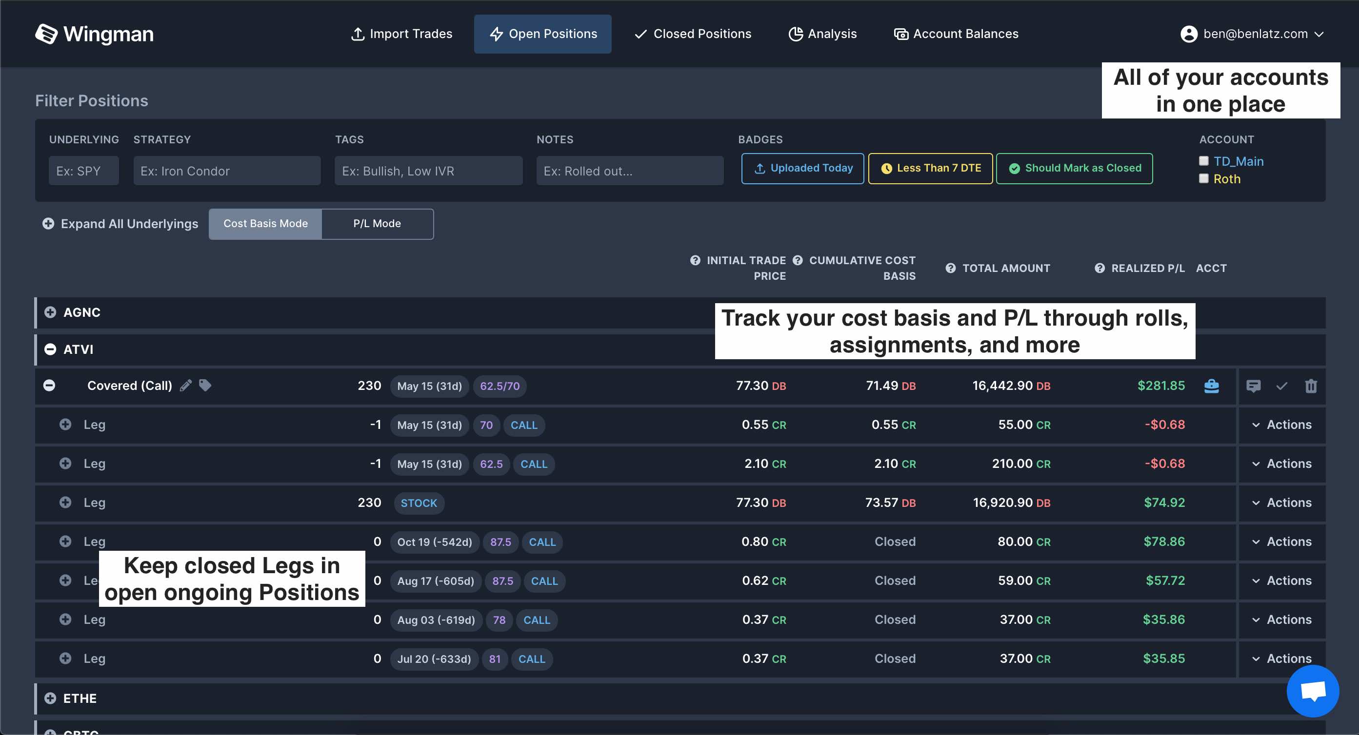 When you roll or adjust positions, Wingman knows how to group the individual legs together to continue the existing position. You can totally customize the grouping of legs to create your desired position group. Ex: A covered call that you've been selling calls in for over a year.
